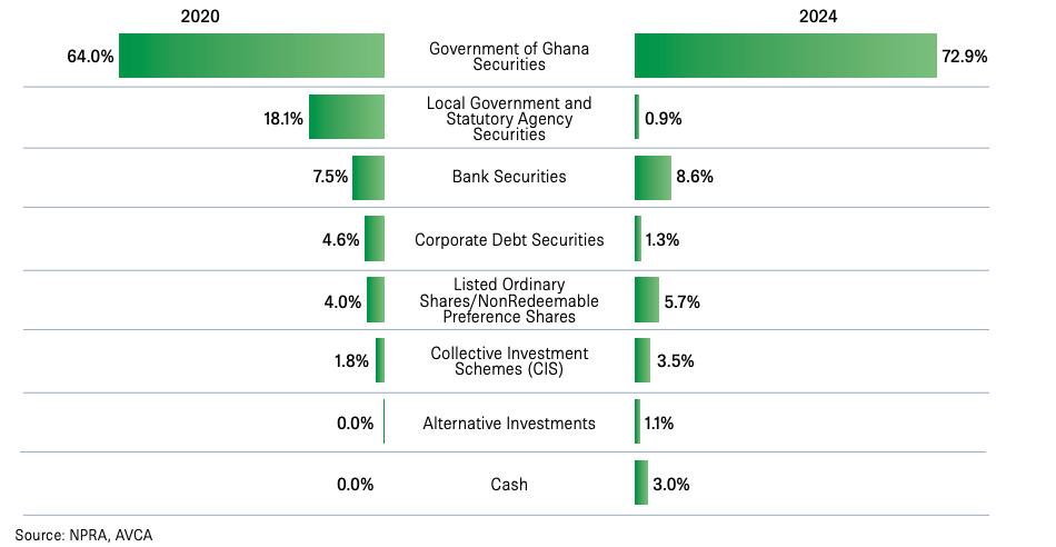 By the end of 2024, pension assets under management had reached GHS 86.4 billion (US$5.9 billion), positioning the system as a key pillar of both social protection and long-term domestic finance. Yet despite this growth, the industry’s investment behaviour remains highly conservative. Up to 75 percent of pension assets are still placed in government securities, valued for safety and predictability, while exposure to alternative assets such as private equity, venture capital, real estate, and private debt represents barely 1.1 percent of total assets.